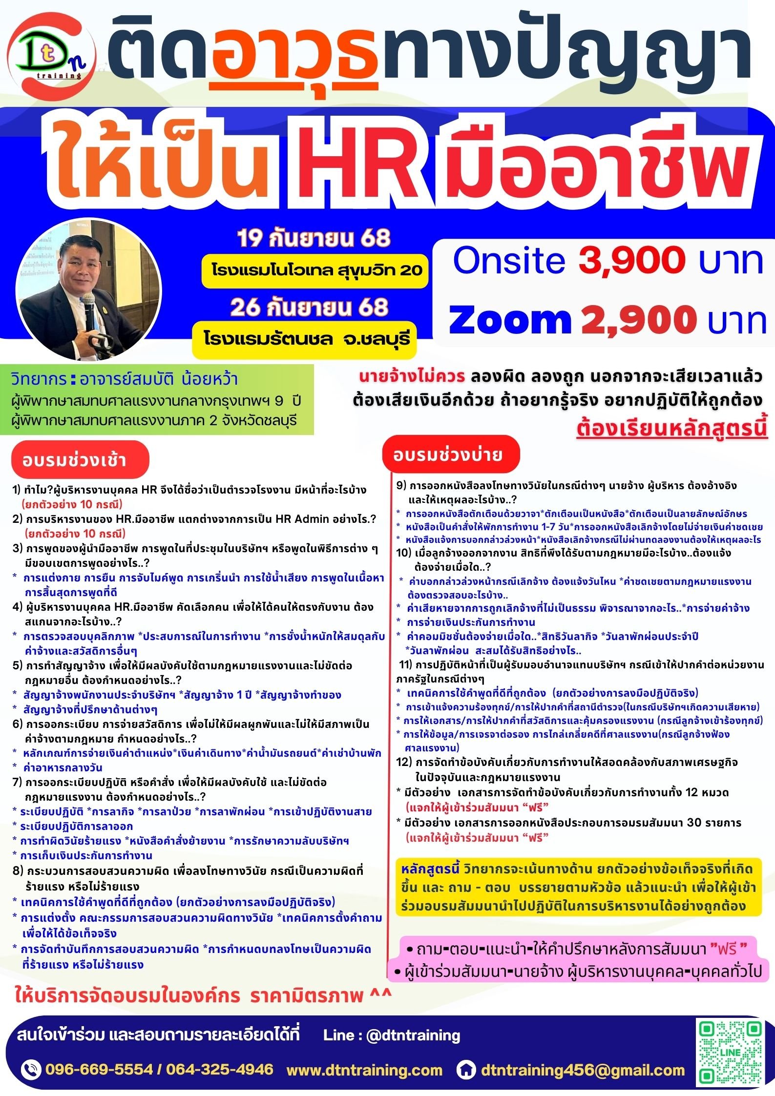 * มีตัวอย่าง เอกสารการจัดทำข้อบังคับเกี่ยวกับการทำงานทั้ง 12 หมวด (แจกให้ผู้เข้าร่วมสัมมนา “ฟรี”)* มีตัวอย่าง เอกสารการออกหนังสือประกอบการอมรมสัมมนา 30 รายการ (แจกให้ผู้เข้าร่วมสัมมนา “ฟรี”) หลักสูตรนี้ วิทยากรจะเน้นทางด้าน ยกตัวอย่างข้อเท็จจริงที่เกิดขึ้น และ ถาม - ตอบ จะบรรยายตามหัวข้อ แล้วแนะนำ เพื่อให้ผู้เข้าร่วมอบรมสัมมนานำไปปฏิบัติในการบริหารงานได้อย่างถูกต้อง - นายจ้างไม่ควร ลองผิด ลองถูก นอกจากจะเสียเวลาแล้ว ต้องเสียเงินอีกด้วย ถ้าอยากรู้จริง อยากปฏิบัติให้ถูกต้อง ต้องเรียนหลักสูตรนี้